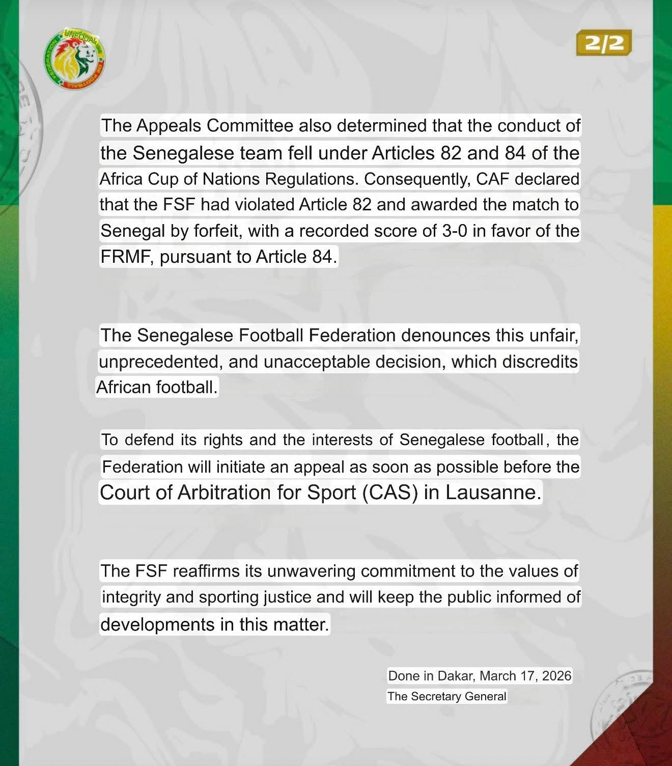 By taking the case to CAS, Senegal is effectively moving the dispute into the highest legal arena in global sport. The Lausanne-based court has the authority to: